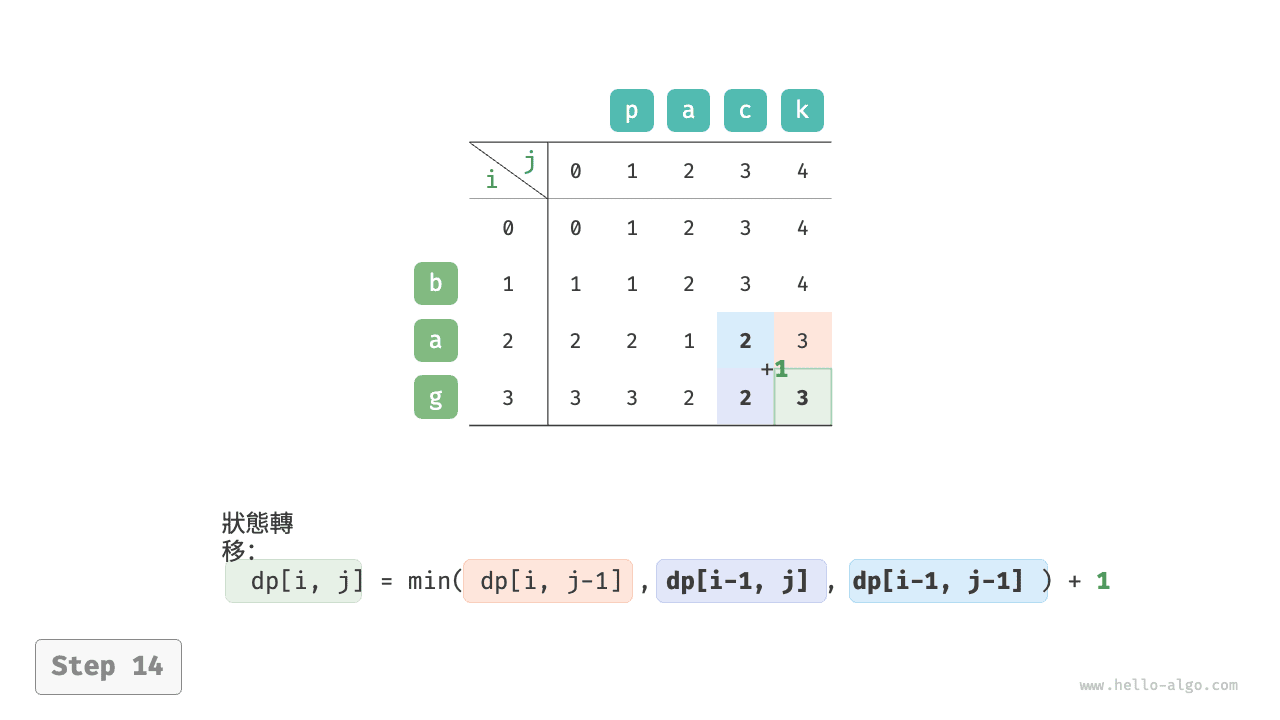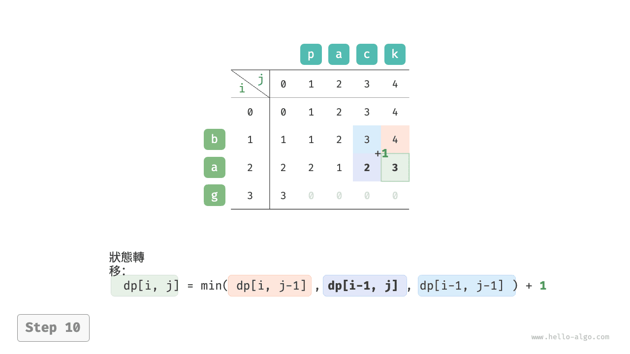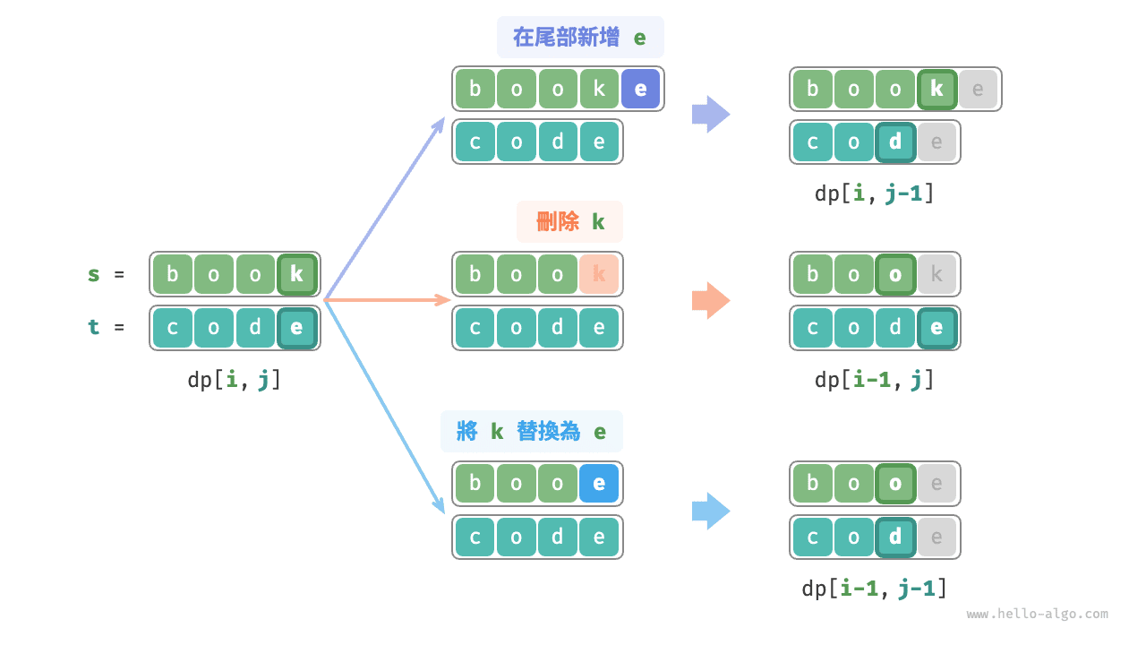 請注意,當 \(s[i-1]\) 和 \(t[j-1]\) 相同時,無須編輯當前字元,這種情況下的狀態轉移方程為: