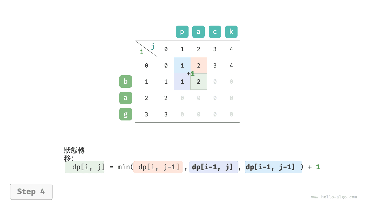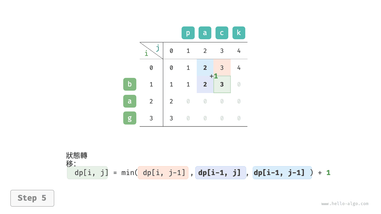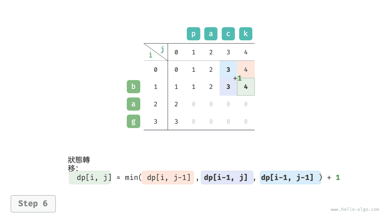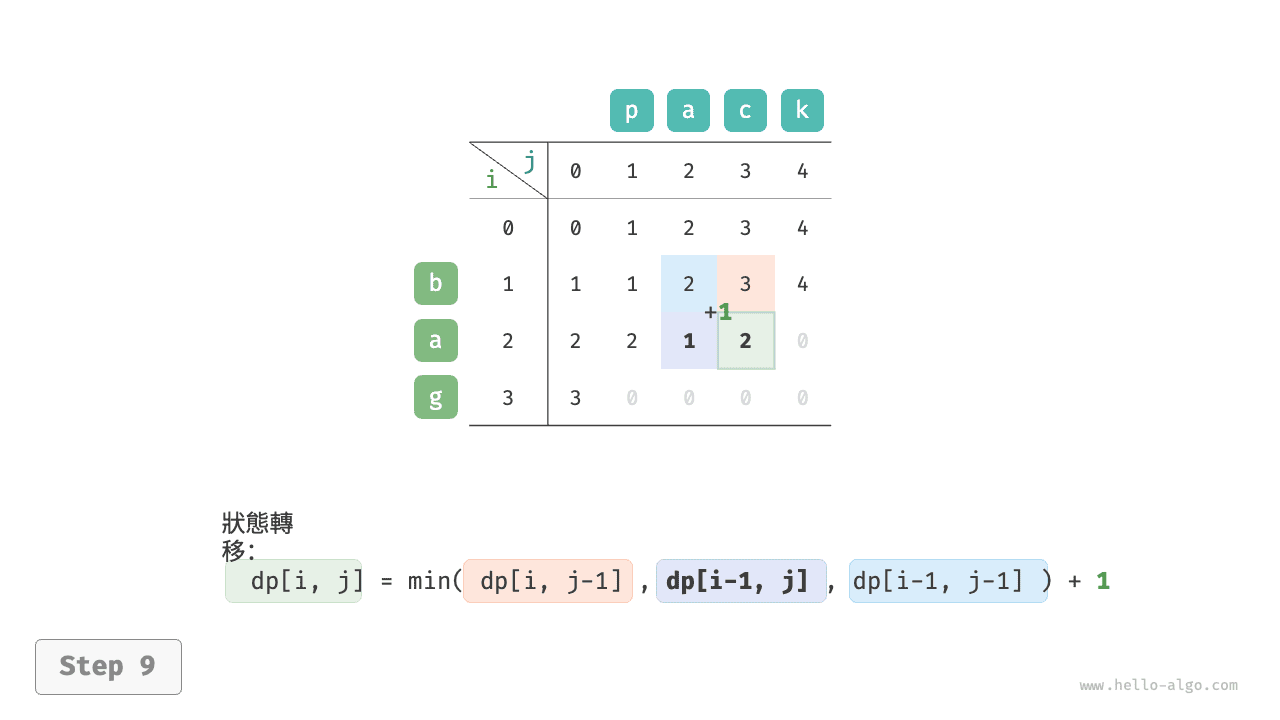 請注意,當 \(s[i-1]\) 和 \(t[j-1]\) 相同時,無須編輯當前字元,這種情況下的狀態轉移方程為: