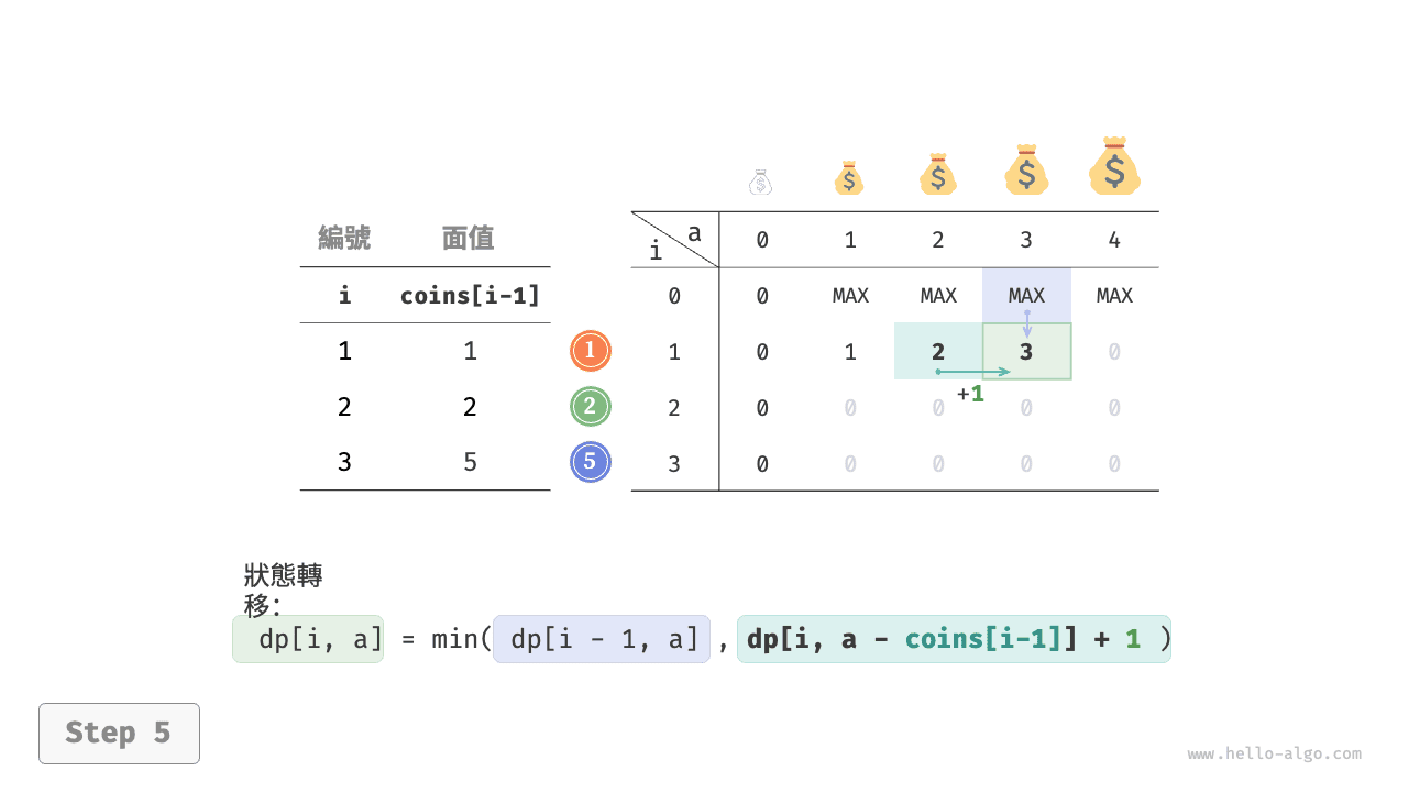 當前狀態的組合數量等於不選當前硬幣與選當前硬幣這兩種決策的組合數量之和。狀態轉移方程為: