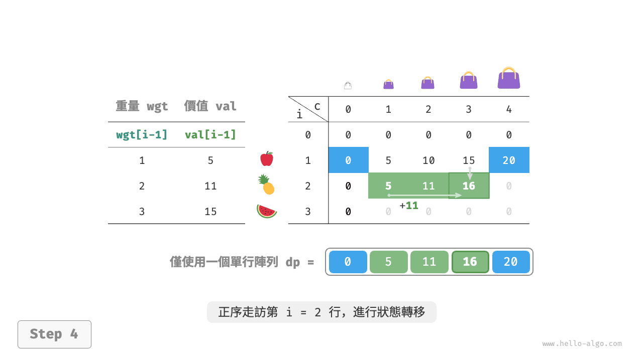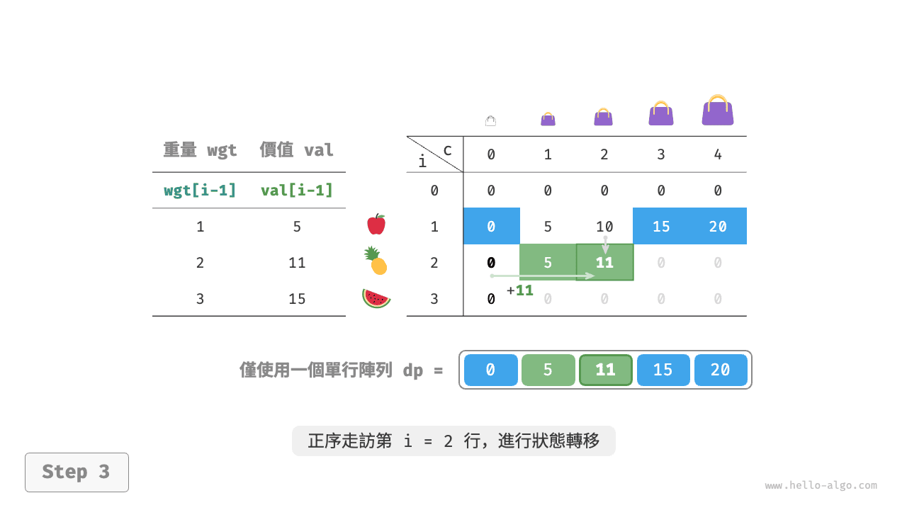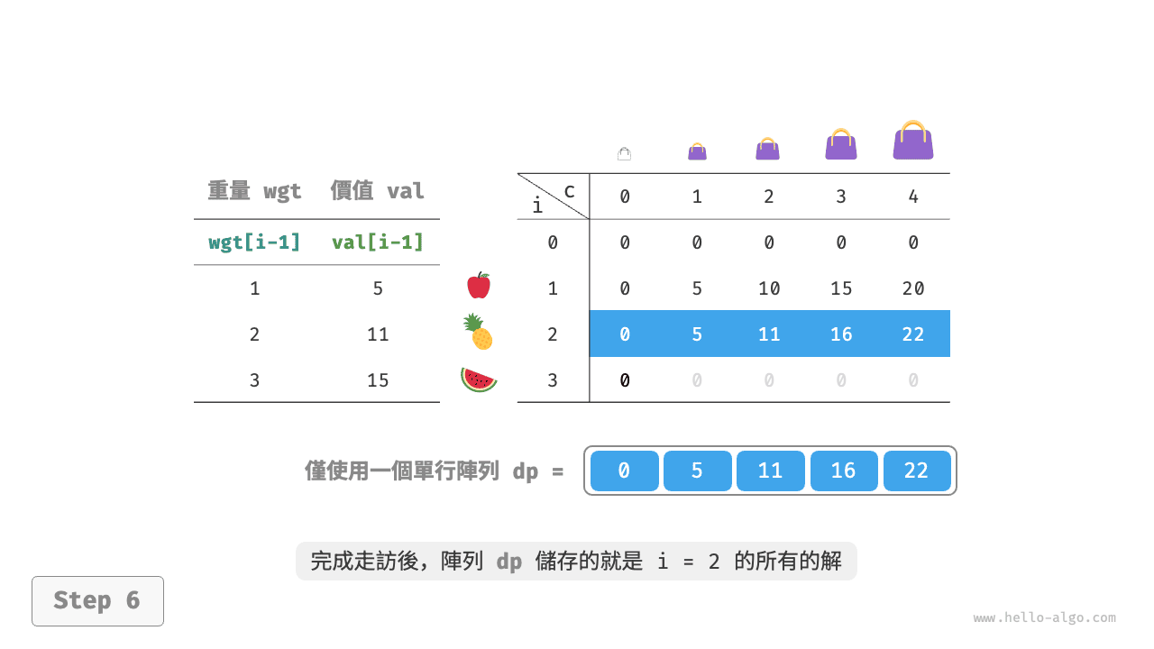 - 在完全背包問題中,每種物品的數量是無限的,因此將物品 \(i\) 放入背包後,仍可以從前 \(i\) 個物品中選擇。