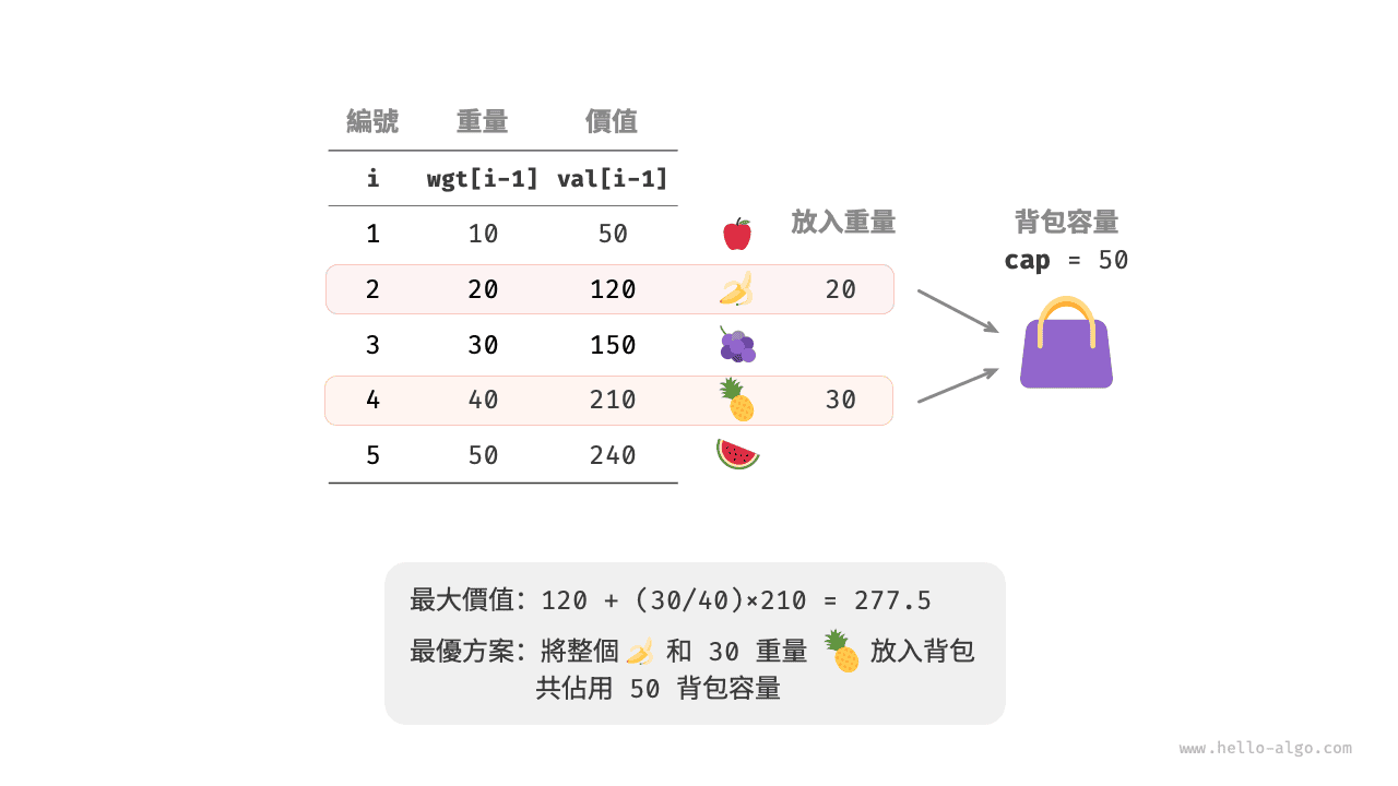 - 若剩餘背包容量不足,則使用當前物品的一部分填滿背包。