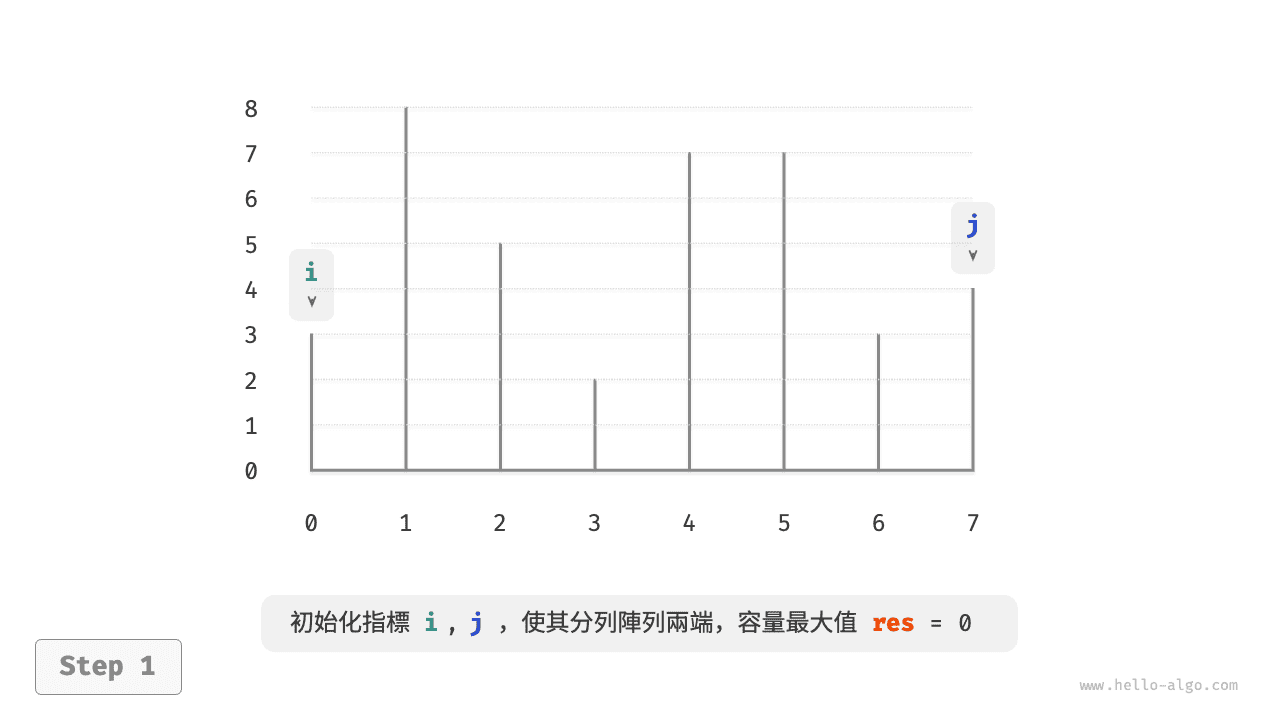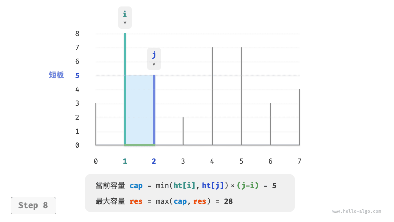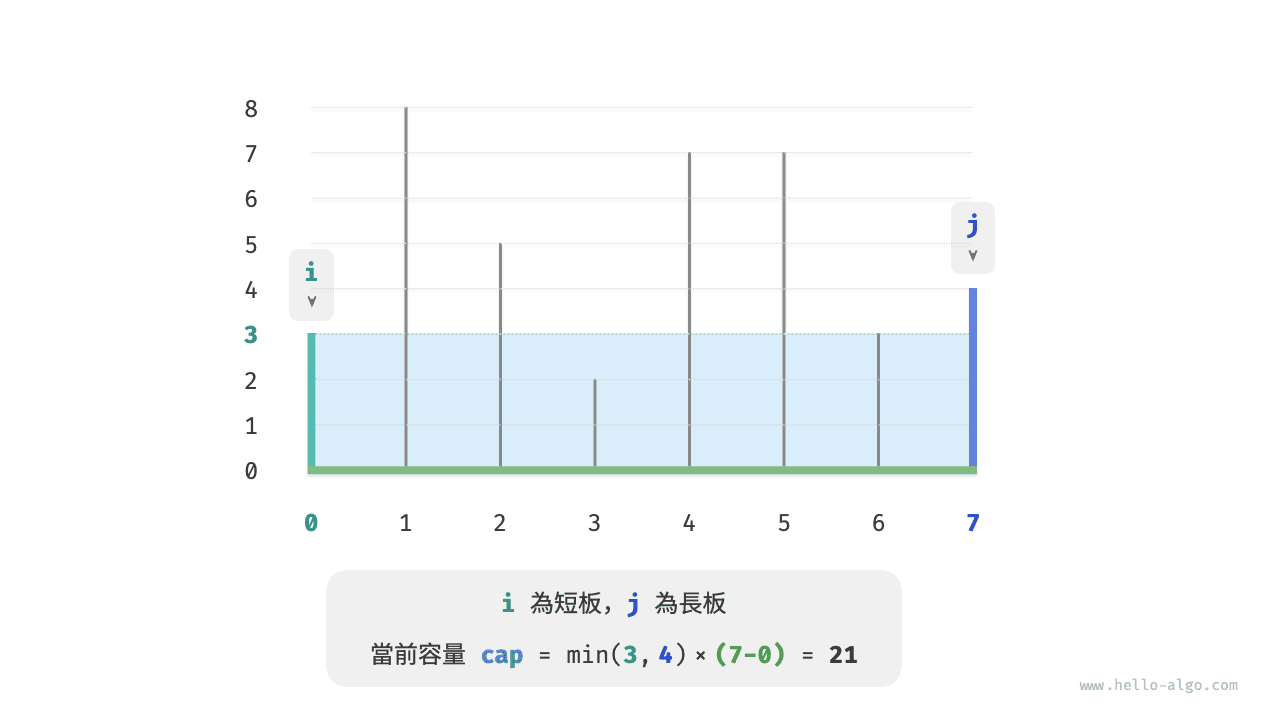 容器的容量等於高度和寬度的乘積(面積),其中高度由較短的隔板決定,寬度是兩個隔板的陣列索引之差。
