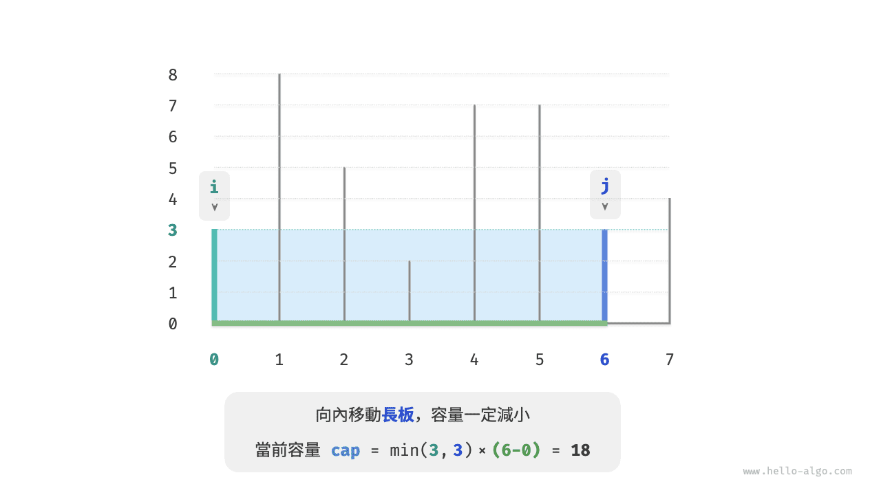 這是因為在移動長板 \(j\) 後,寬度 \(j-i\) 肯定變小;而高度由短板決定,因此高度只可能不變( \(i\) 仍為短板)或變小(移動後的 \(j\) 成為短板)。