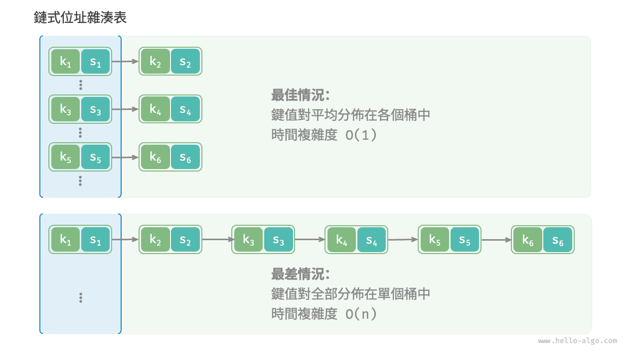 如果雜湊衝突過於頻繁,雜湊表的效能則會急劇劣化。如圖 6-8 所示,對於鏈式位址雜湊表,理想情況下鍵值對均勻分佈在各個桶中,達到最佳查詢效率;最差情況下所有鍵值對都儲存到同一個桶中,時間複雜度退化至 \(O(n)\) 。