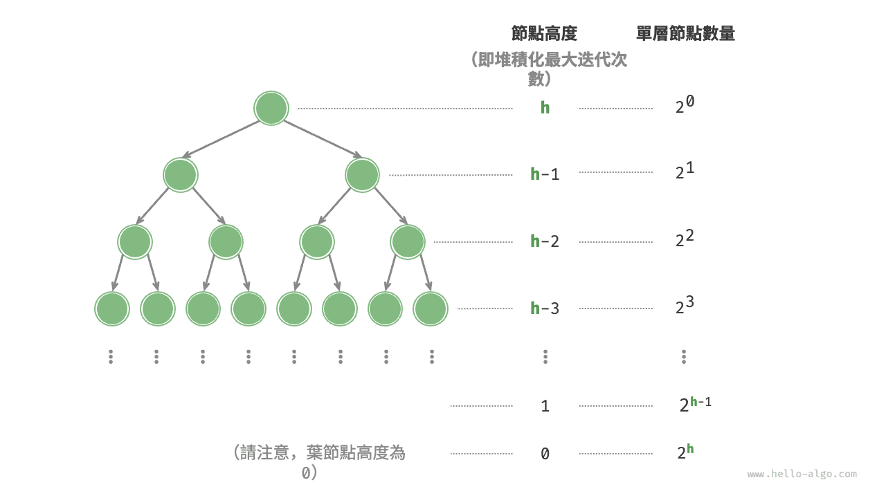 如圖 8-5 所示,節點“從頂至底堆積化”的最大迭代次數等於該節點到葉節點的距離,而該距離正是“節點高度”。因此,我們可以對各層的“節點數量 \(\times\) 節點高度”求和,得到所有節點的堆積化迭代次數的總和。