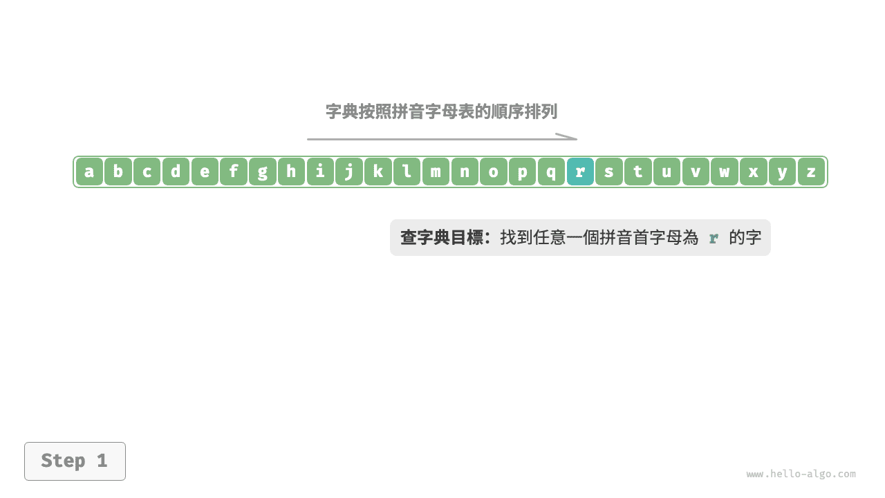 例一:查字典。在字典裡,每個漢字都對應一個拼音,而字典是按照拼音字母順序排列的。假設我們需要查詢一個拼音首字母為 \(r\) 的字,通常會按照圖 1-1 所示的方式實現。