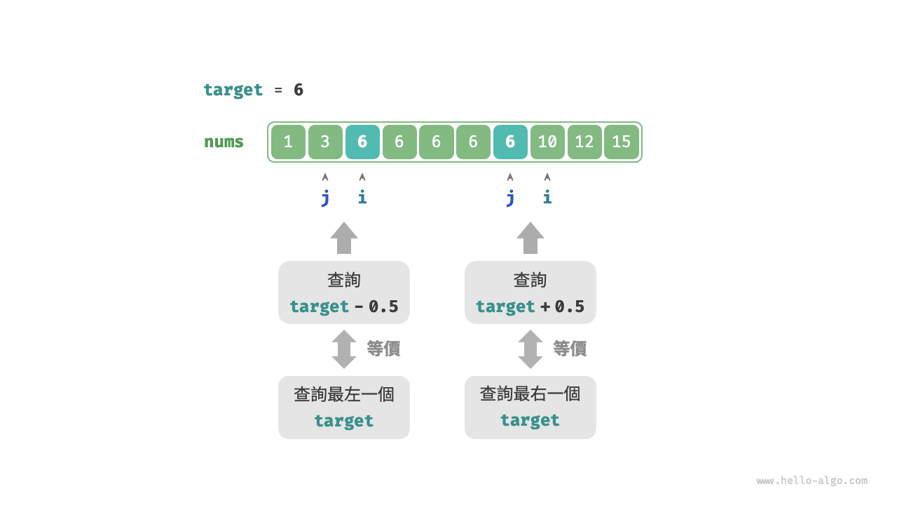 如圖 10-7 所示,查詢完成後,指標 \(i\) 指向最左一個 target + 1(如果存在),而 \(j\) 指向最右一個 target ,因此返回 \(j\) 即可。