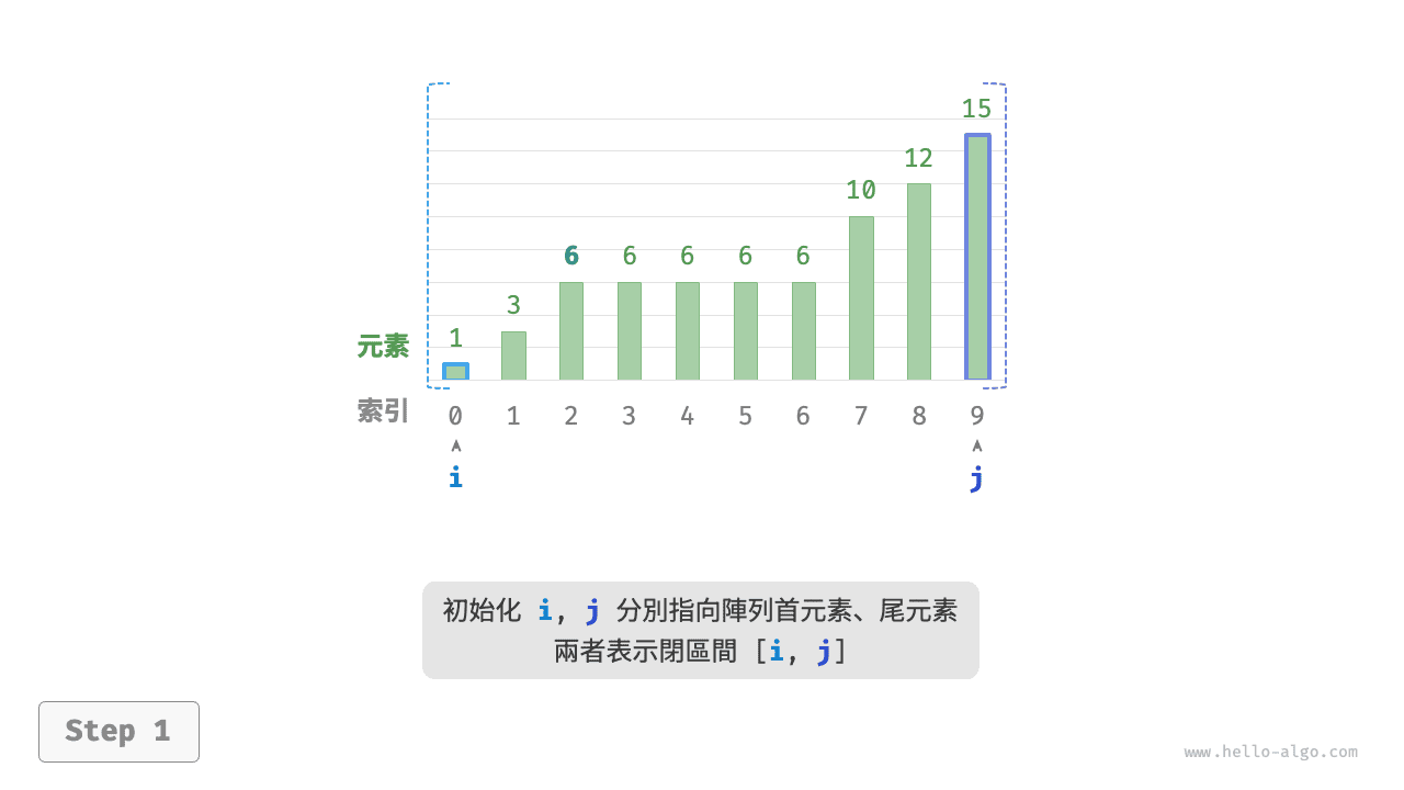 int i = 0, j = numSize - 1; // 初始化雙閉區間 [0, n-1]