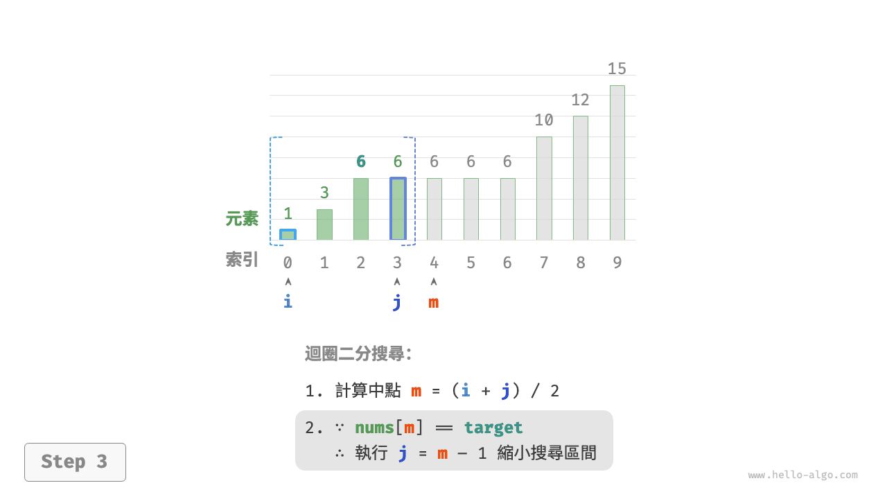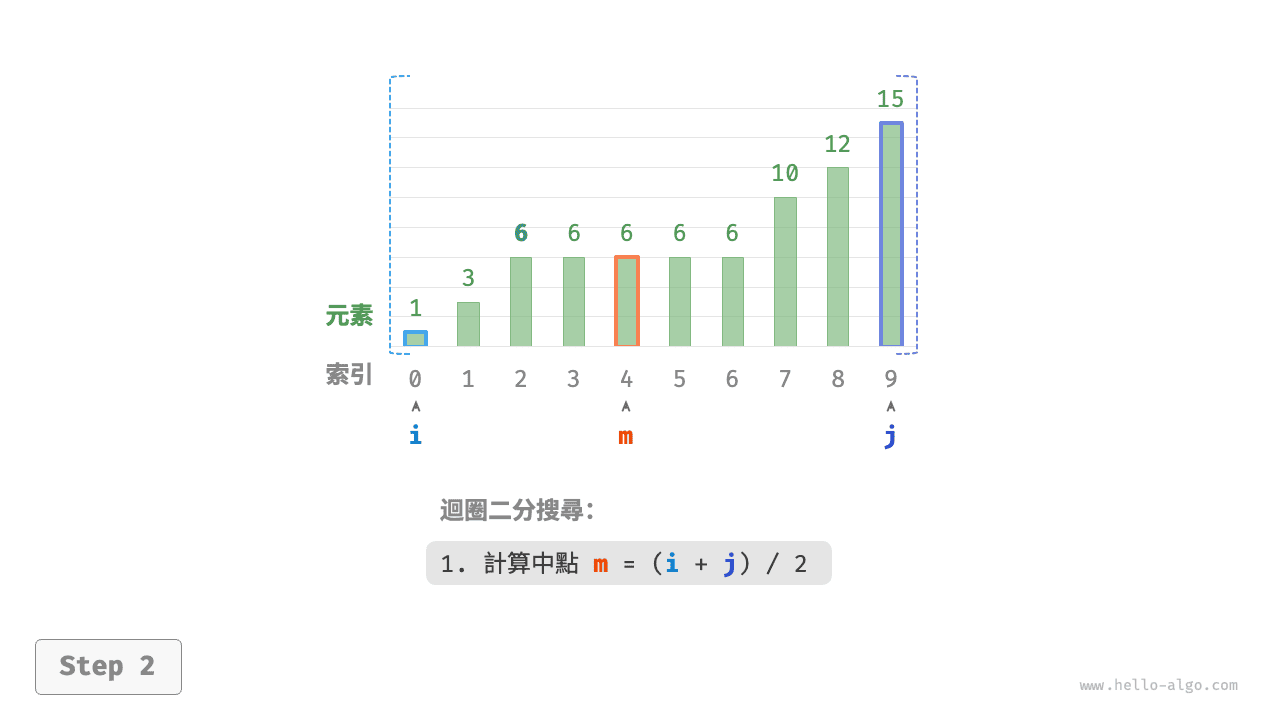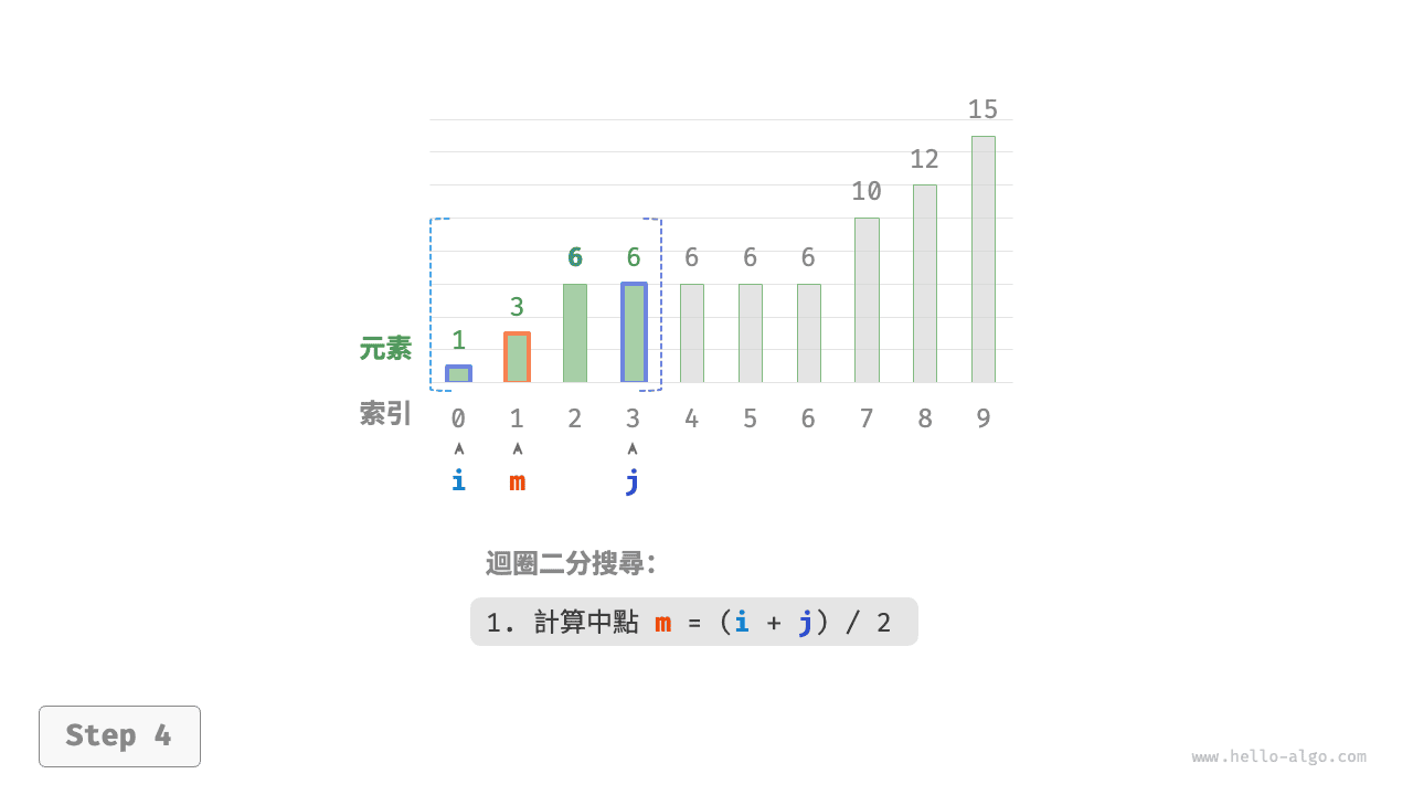 m = (i + j) // 2 # 計算中點索引 m