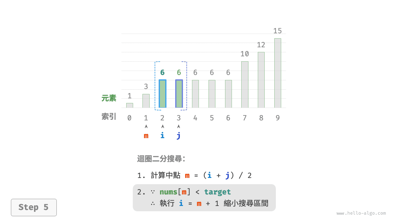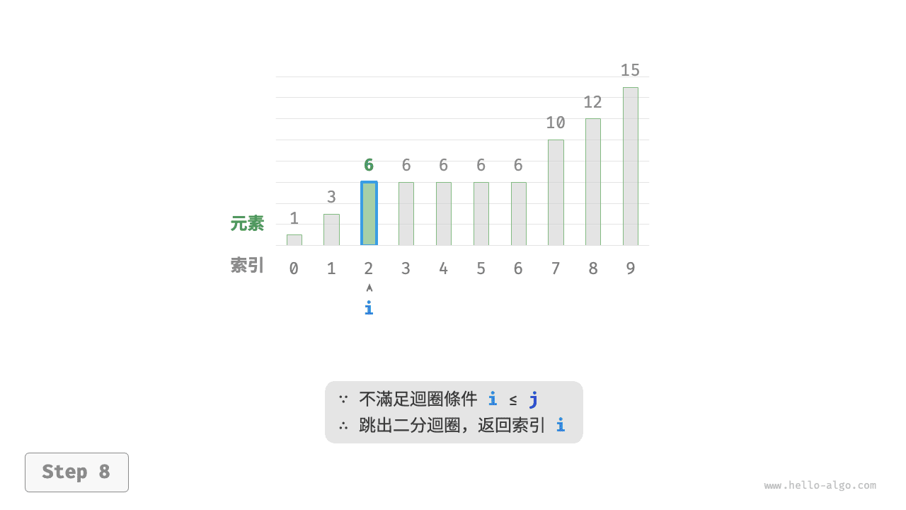 迴圈完成後,\(i\) 指向最左邊的 target ,\(j\) 指向首個小於 target 的元素,因此索引 \(i\) 就是插入點。