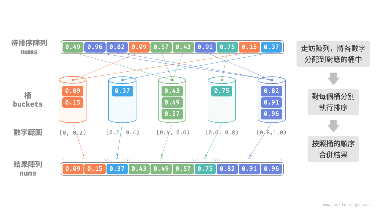 - 對每個桶分別執行排序(這裡採用程式語言的內建排序函式)。