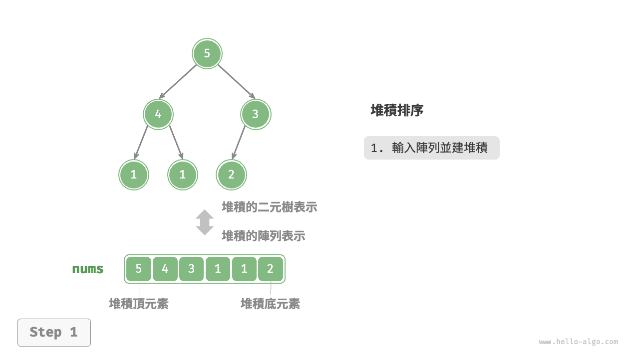 - 輸入陣列並建立大頂堆積。完成後,最大元素位於堆積頂。