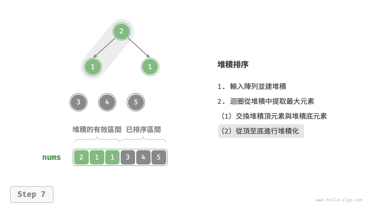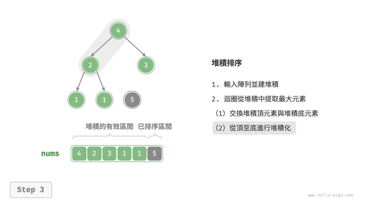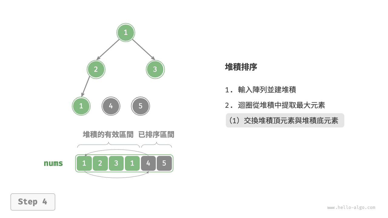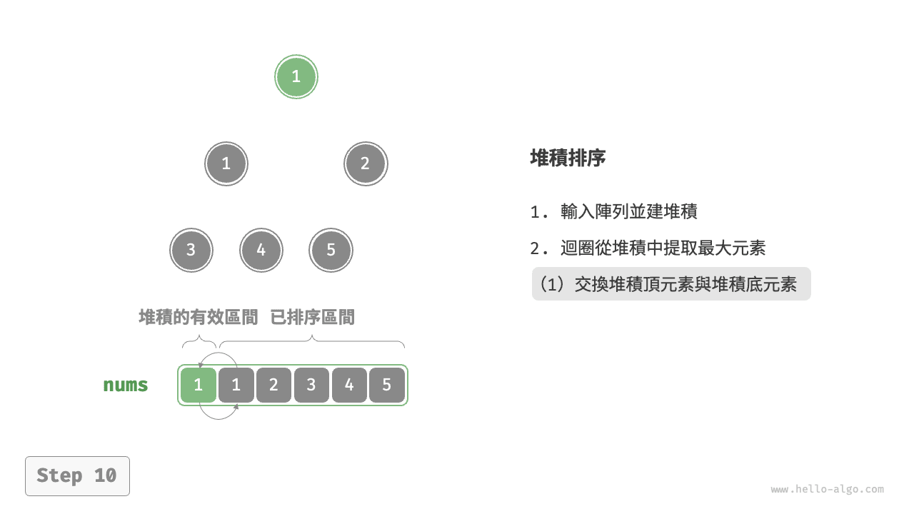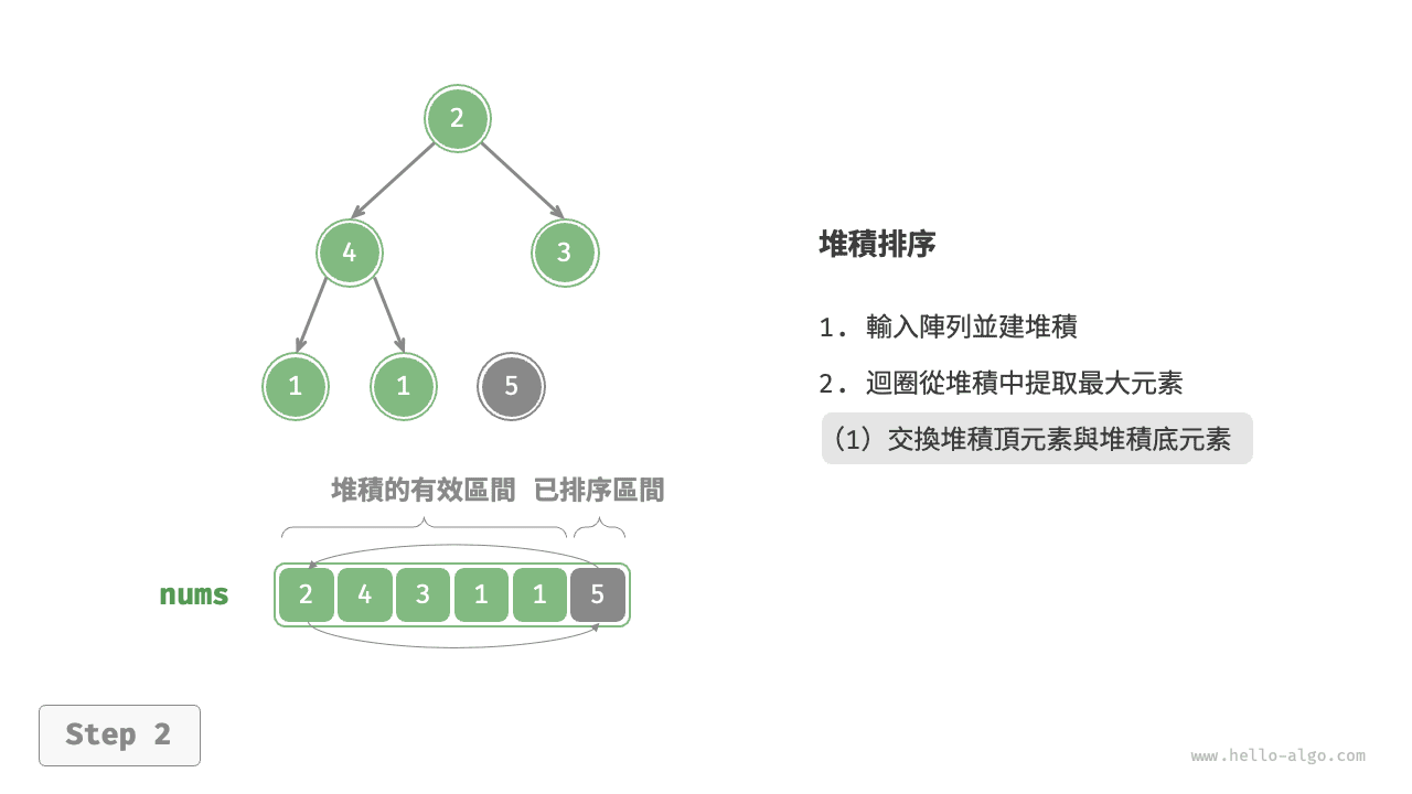 - 將堆積頂元素(第一個元素)與堆積底元素(最後一個元素)交換。完成交換後,堆積的長度減 \(1\) ,已排序元素數量加 \(1\) 。