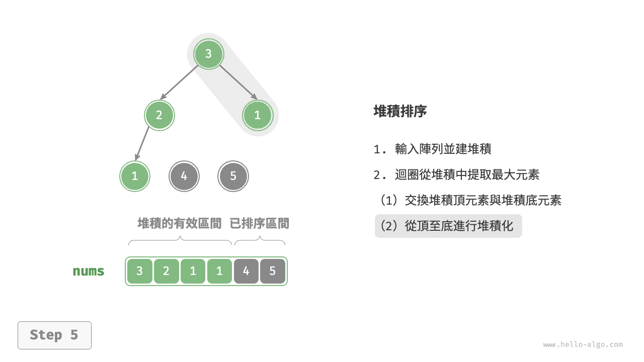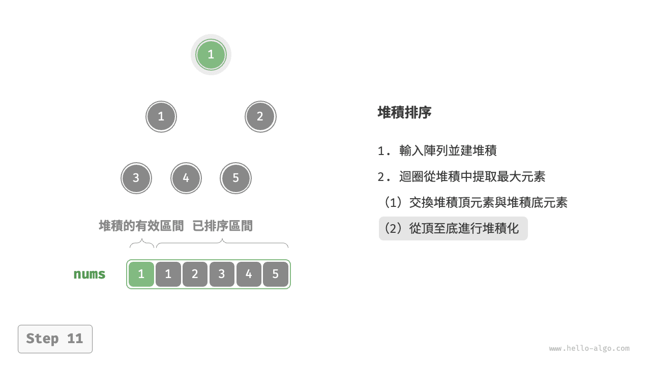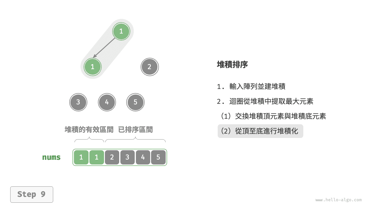 - 非穩定排序:在交換堆積頂元素和堆積底元素時,相等元素的相對位置可能發生變化。