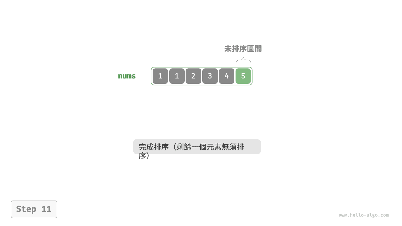 - 僅剩的一個元素必定是最大元素,無須排序,因此陣列排序完成。