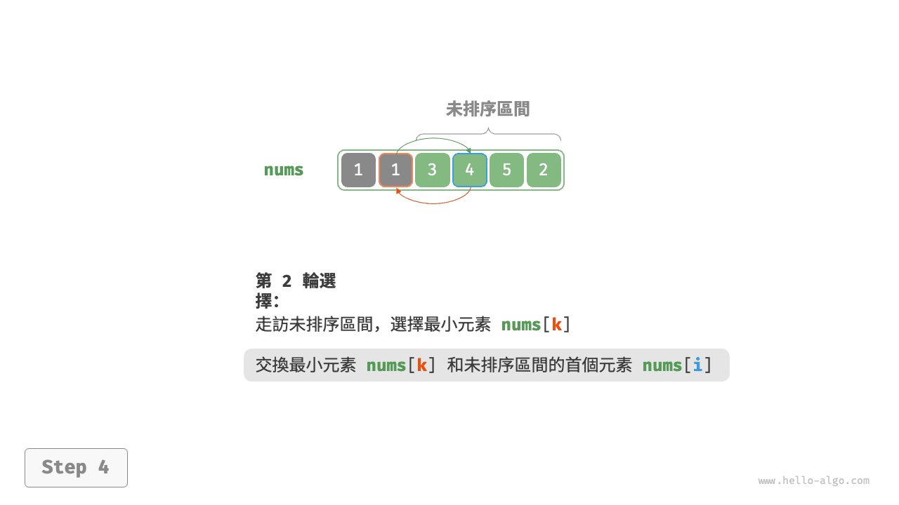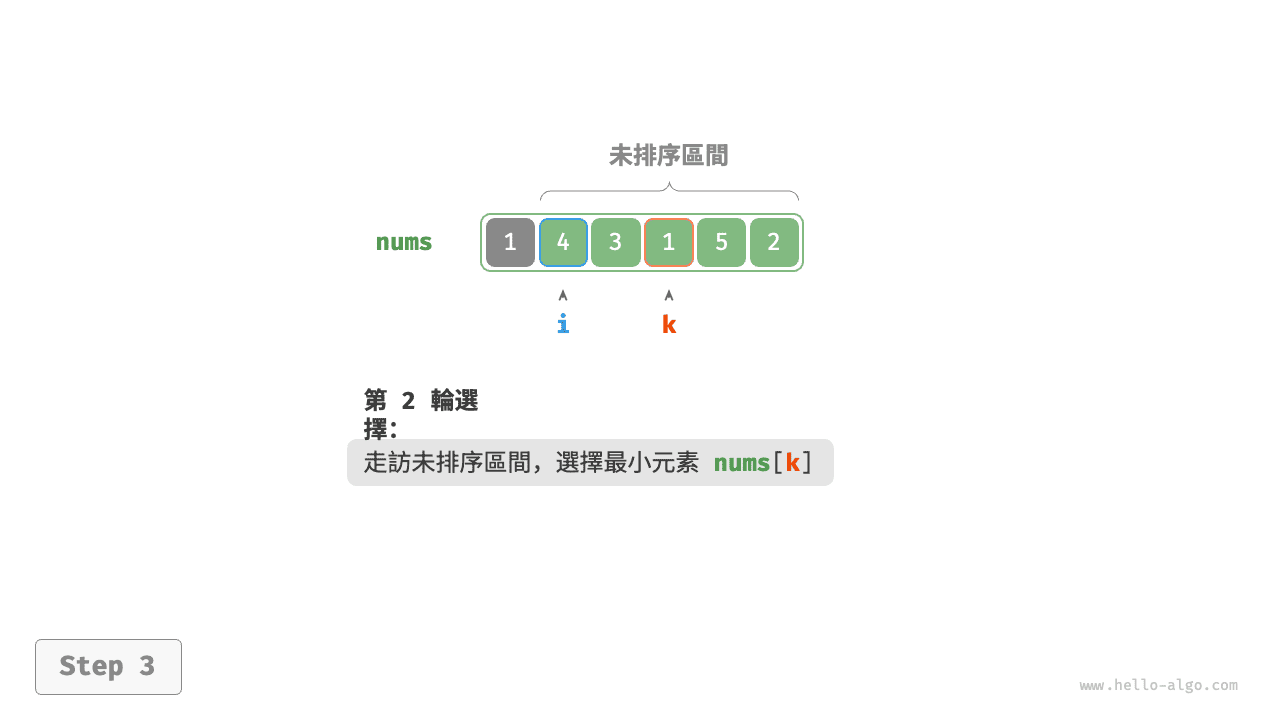- 以此類推。經過 \(n - 1\) 輪選擇與交換後,陣列前 \(n - 1\) 個元素已排序。