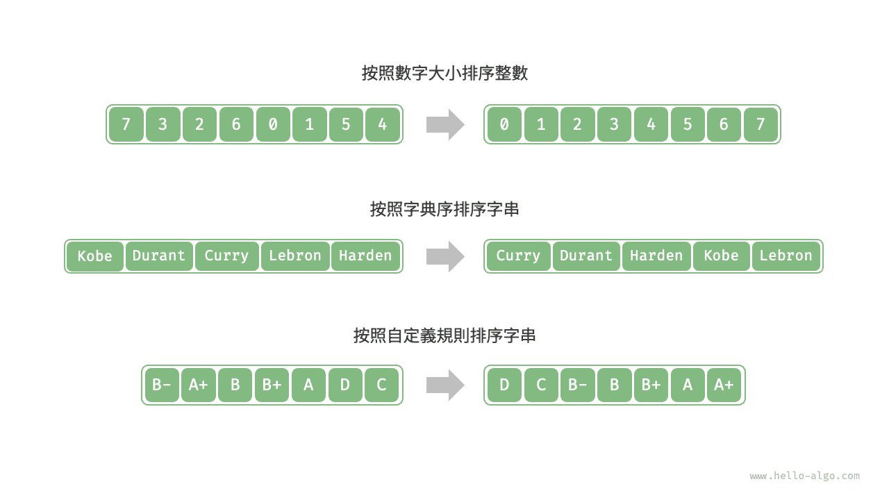 如圖 11-1 所示,排序演算法中的資料型別可以是整數、浮點數、字元或字串等。排序的判斷規則可根據需求設定,如數字大小、字元 ASCII 碼順序或自定義規則。