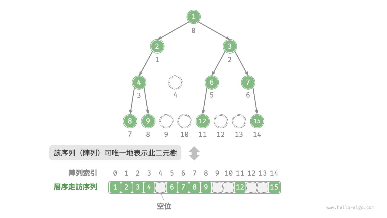 先分析一個簡單案例。給定一棵完美二元樹,我們將所有節點按照層序走訪的順序儲存在一個陣列中,則每個節點都對應唯一的陣列索引。