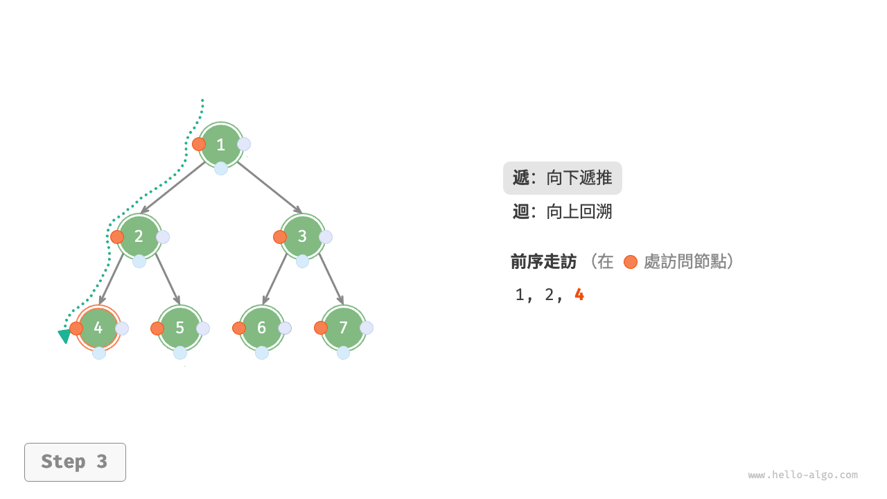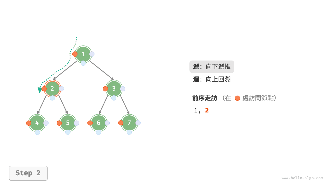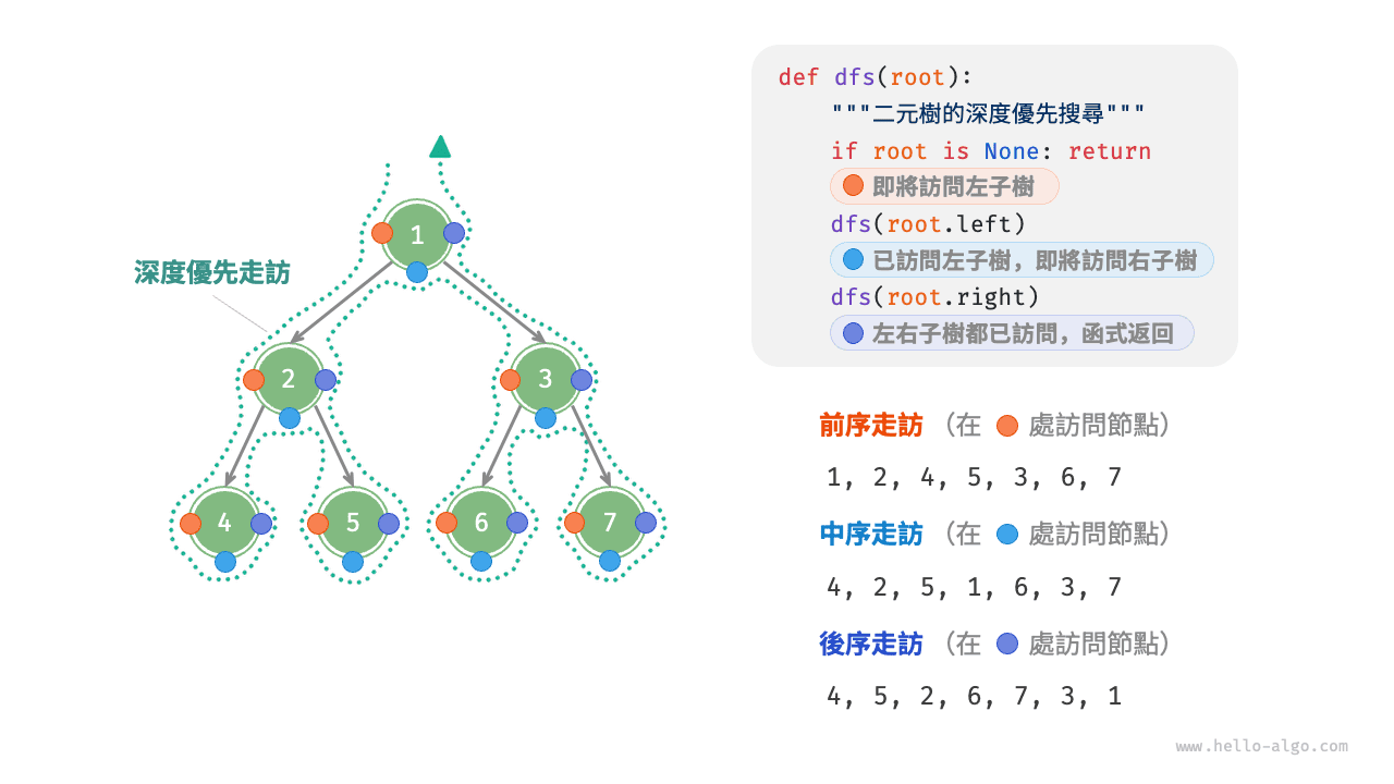- 時間複雜度為 \(O(n)\) :所有節點被訪問一次,使用 \(O(n)\) 時間。