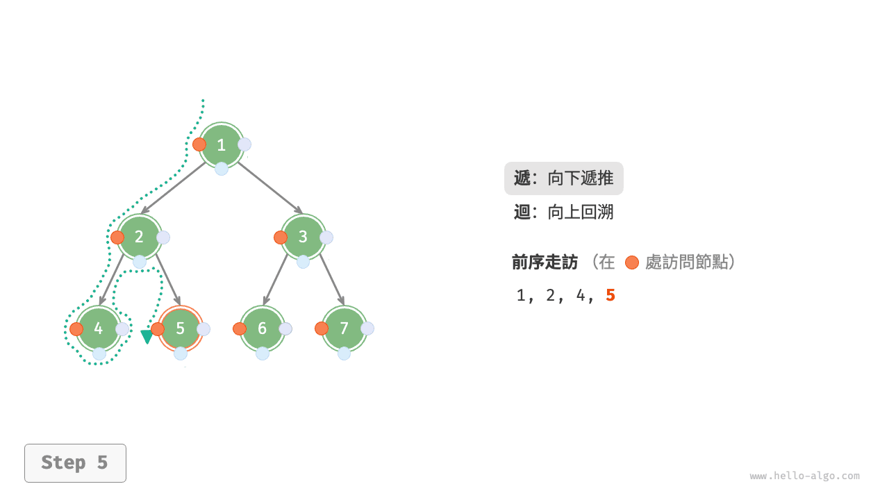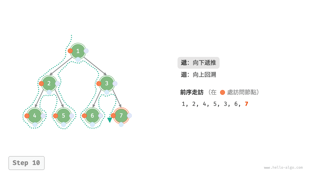 圖 7-11 展示了前序走訪二元樹的遞迴過程,其可分為“遞”和“迴”兩個逆向的部分。